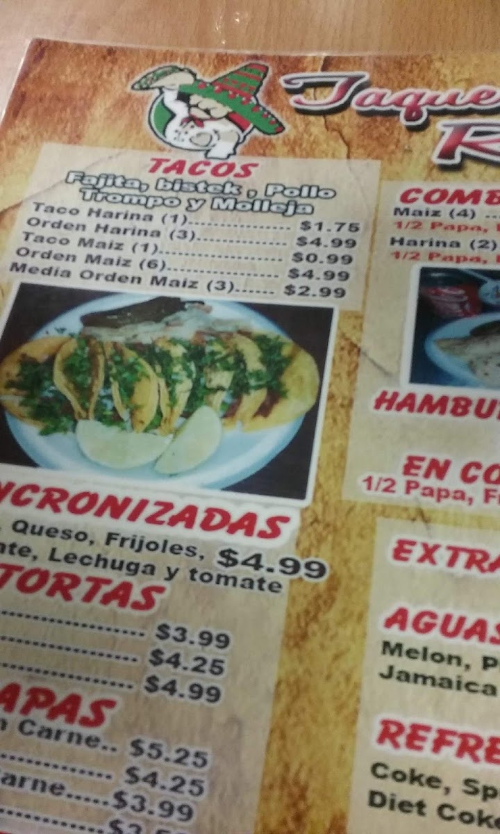 - Tacos: Taco Maiz for $5.40, Media Orden Maiz at $2.99 for three
